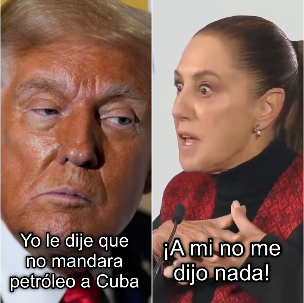Tras su llamada del jueves y luego de amenazar con imponer aranceles a los países que le mandaran de la verde a los hijos de Fidel, la Mandarina Republicana contó que fue claro en decirle a ShameBee que su KPI del mes era cero envíos de petróleo a la Isla. Ante toda esta evidencia, a nuestra pobre Doctora no le quedó de otra más que salir el domingo, con la cola entre las patas (sabiendo el cague que se le viene desde Palenque), a reconocer que efectivamente todos los envíos de petróleo hasta Cuba están suspendidos en lo que se encuentra “la vía diplomática” para poder seguirle regalando Pemex a Silvio Rodríguez. Hay que reconocerle a ShameBrown los malabares que está haciendo para evitar que la Internacional Comunista la expulse, mientras intenta evitar que el Trumpetas venga a llevarse a todos sus amigos… Así la soberanía mexicana.