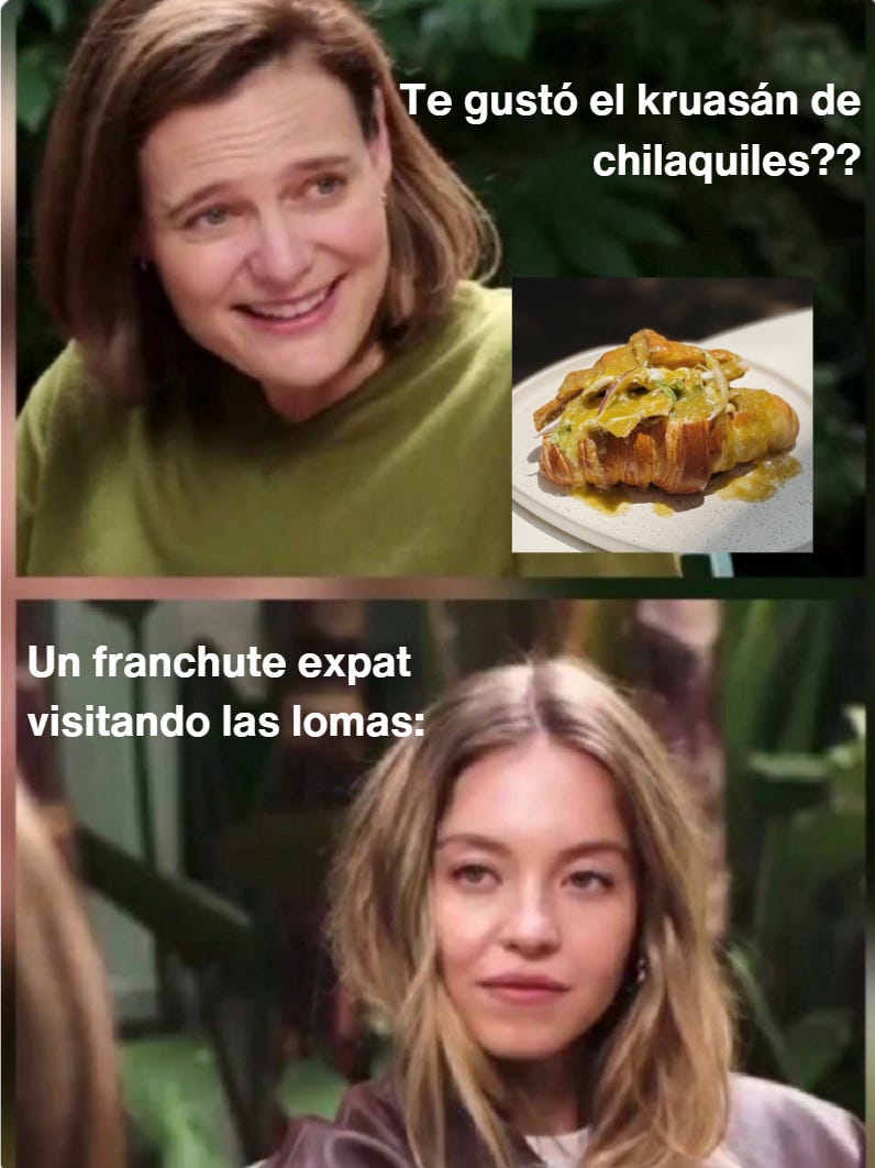 Sr. Croissant (prado norte 218) que conocíamos ya en la condesa, dicen ser un laboratorio de pan (whatever that means) y acaba de abrir en las lomas. El lugar es chiquito, elegante y perfectamente “instagrammeable”. Todo huele a gloria y a mantequilla de vaca de libre pastoreo en los alpes franceses. Los croissants hacen un performance ASMR cada que los muerdes, y el de almendra está tan bueno que hasta Macron se quedaría otro sexenio. Tienen más como el de chilaquiles, concha y mezcla de pancakes con croissant pero no nos atrevimos a tanto. El café, eso sí, cuesta como si lo hubiera hecho Brigitte Macron herself (o himself?), pero se le perdona. Recuerden que si piden un “cruasán” los van a barrer, entonces vayan practicando el “kwasón” antes de llegar.