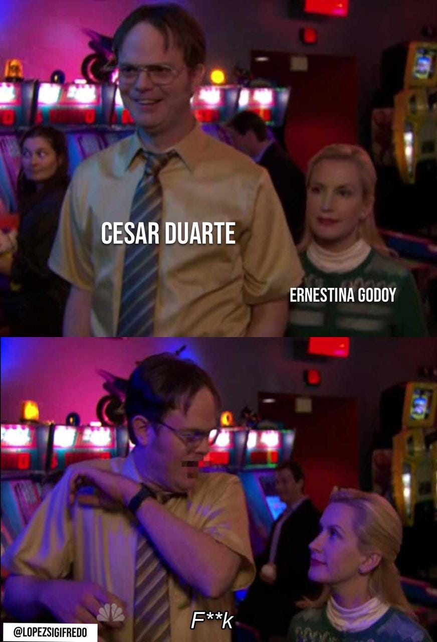 Llenando el Papeleo: Cuando contratamos al intern le tomó más o menos 6 semanas de aclimatación para empezar a trabajar, pero gracias a Dios no es el caso de Titina, que no ha quitado ni las telarañas de la momia anterior y ya anda resolviendo. Para que no quede duda de cómo va a estar la cosa, su primer acto fue detener a un priista de cepa de tiempos de PeñaBB del estado favorito de Adams Augusto: Chihuahua. Se trata de Cesar Duarte, que no solo comparte apellido con Javidu, si no que según Titina, también comparten el hobbie de los malos pasos. Lo detuvieron en el Estado Grande acusado de lavado de dinero y en chinga lo mandaron al Altiplano. El wey había sido detenido en Miami hace años, pero le habían dejado estar en libertad… hasta ayer, que nuestra amiga de Wazowski le dejó ver quién está a cargo ahora.