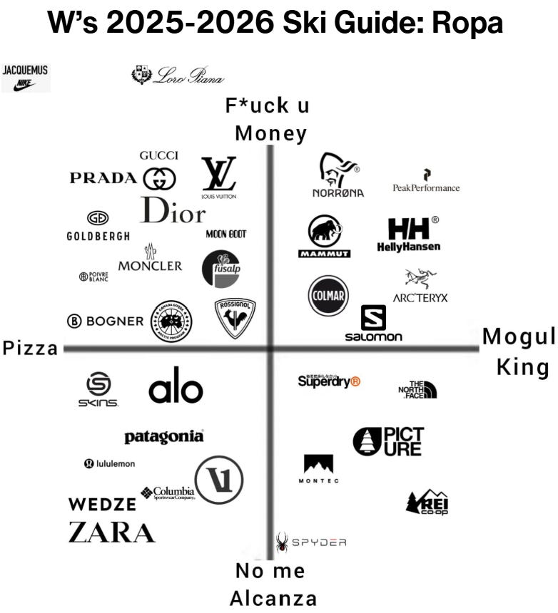 Hoy es thanksgiving y honestamente tenemos una sola cosa que agradecer este año: el arranque del ski season. Como ya es costumbre, sabemos que todo mundo aquí quiere dar el gatazo de que aprendieron a esquiar antes que a caminar y que el 90% de su infancia la pasaron en chalets de Colorado o Suiza (aunque realmente vayas una vez cada 2 años a Park City). Para esto, les tenemos preparadas una serie de guías para que no se vean tan aztecas en las pistas este invierno. Este año decidimos arrancar con la guía de marcas de ropa, porque la experiencia realmente empieza desde el shopping previo y sobre todo porque lo importante no es cómo le des, si no cómo te ves. Ya sea que lo tuyo sea bajar por moguls y negras de 9 a 4 seguido por 5 horas de Folie Douce, o que solo agarres el lift para tomarte fotos en tu onesie arriba de la montaña como modelo rusa, te decimos qué marca es la buena.